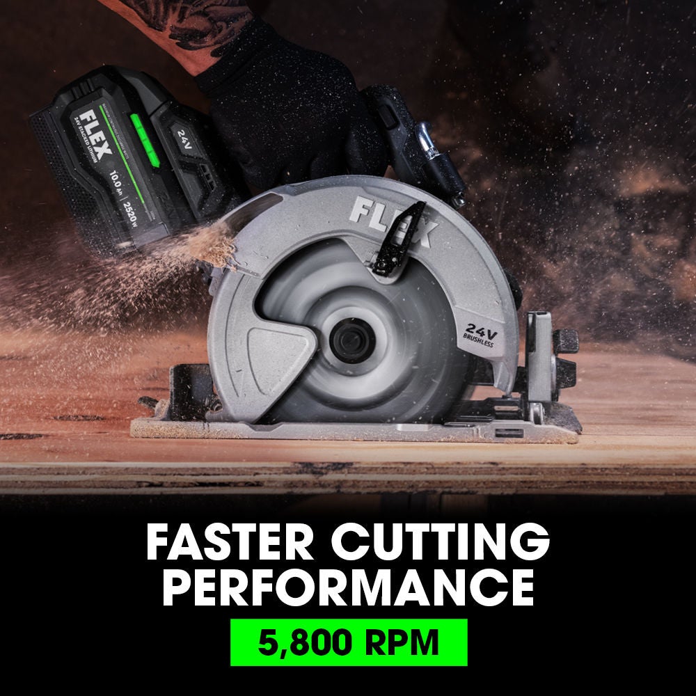 Experience exceptional runtime with up to 610 cuts in 2×4 lumber using a 10.0Ah Stacked Lithium Battery. The magnesium footplate and guards provide lightweight durability, while the sensor-free brushless motor in every FLEX 24V tool is intelligently designed for higher efficiency, power, and friction elimination. Achieve ultimate performance with 5,800 RPM for faster cutting.