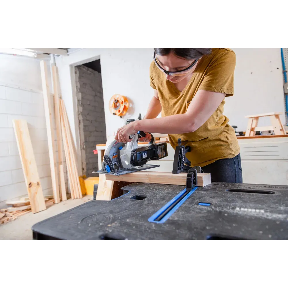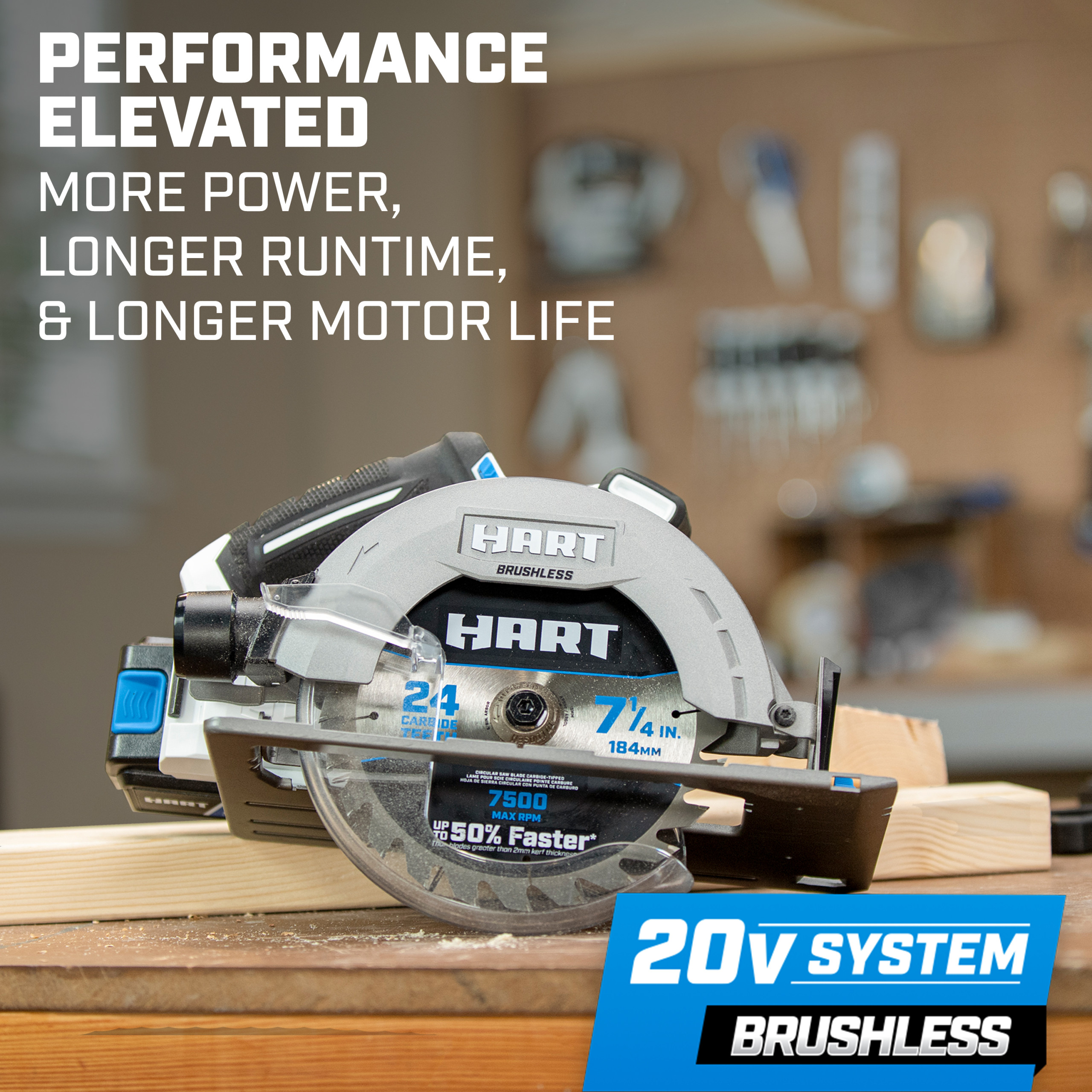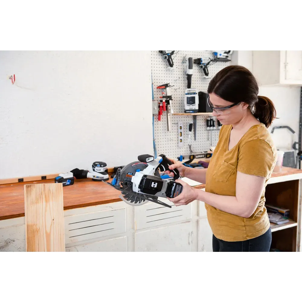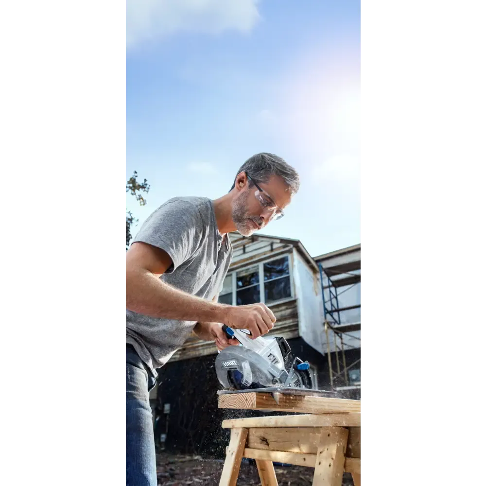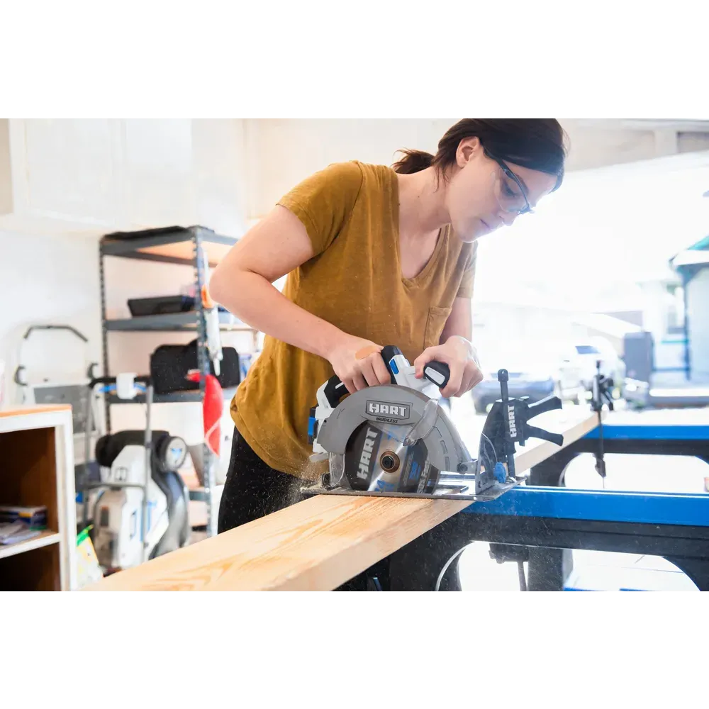 Transform your cutting routine with HART’s 20V 7-1/4″ Brushless Cordless Circular Saw. This cutting powerhouse features a brushless motor for increased power, longer runtime, and extended tool life. With the use of the 20V HART battery, the Brushless motor can make cuts up to 38% faster, with a max speed of 4,000 RPM and 34% more cuts per charge.